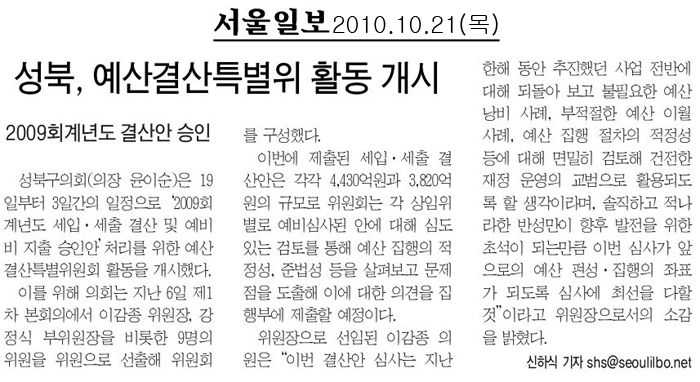 | 다음글 | 2010. 10. 28(목) 성북신문 보도내용 |