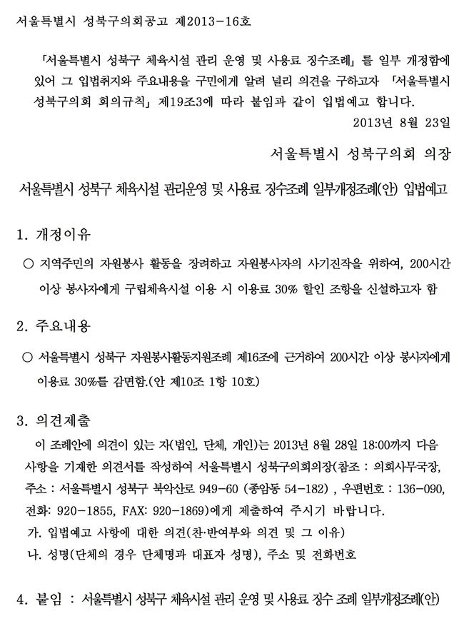 | 서울특별시 성북구 체육시설 관리 운영 및 사용료 징수조례 일부개정조례안 | |||||