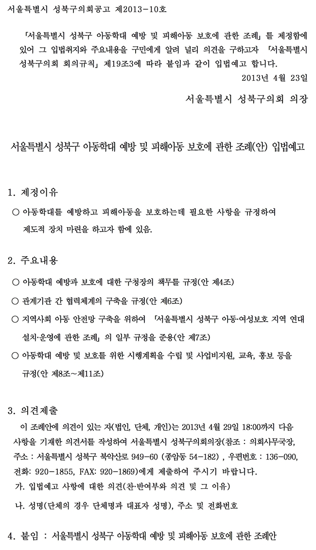 | 서울특별시 성북구 아동학대 예방 및 피해아동 보호에 관한 조례안 입법예고 | |||||
