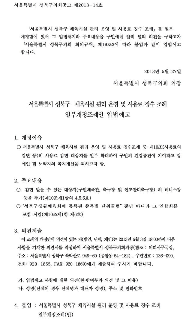 | 서울특별시 성북구 체육시설 관리 운영및 사용료 징수 조례 일부개정 조례(안) 입법예고 | |||||